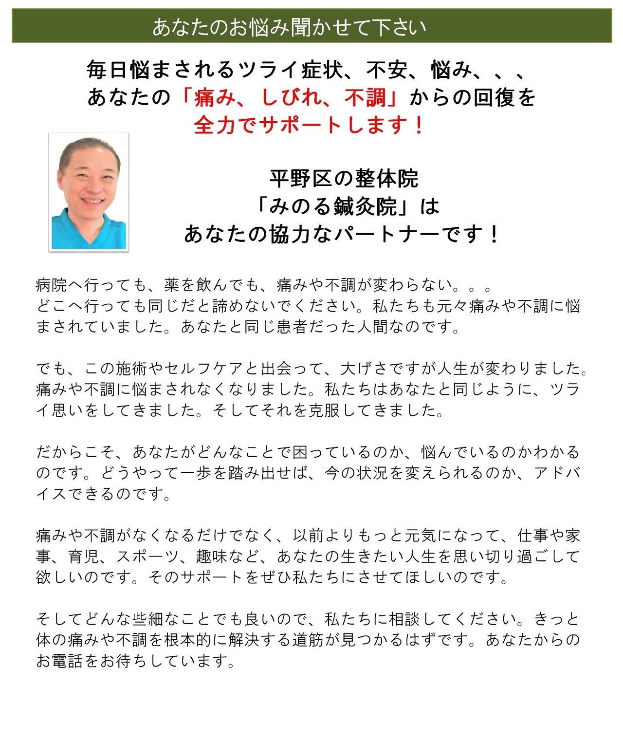 長年の経験を活かし、あなたの症状に合わせたオーダーメイドの施術を提供します。痛みや不調を放っておかず、今すぐ行動を起こしましょう。痛みのない生活を取り戻すために、一緒に解決していきましょう。 あなたがもう一度、自由に体が動かせる日が来ることを心から願っています。